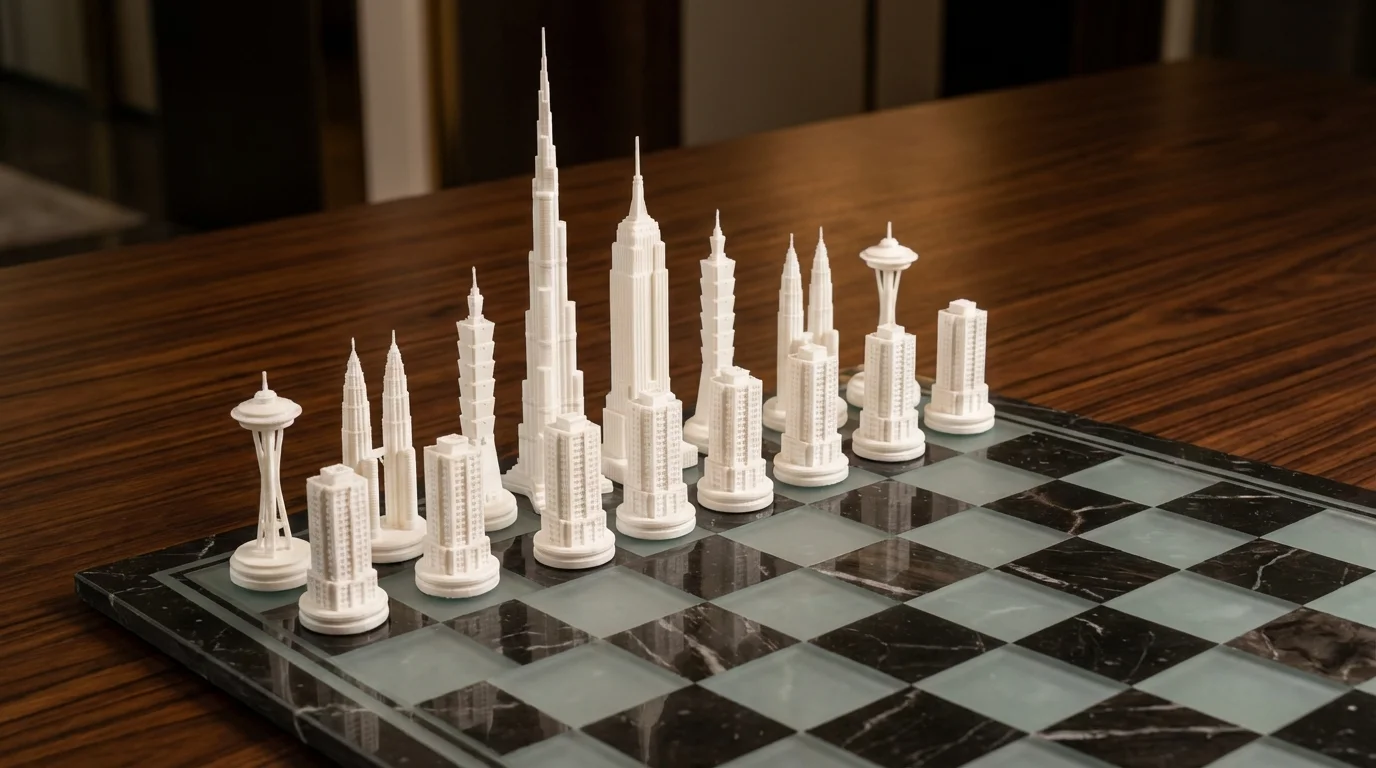 City skylines become chess pieces. Designed to be played, displayed, and gifted.